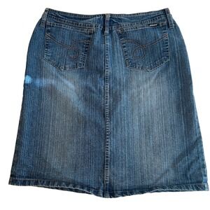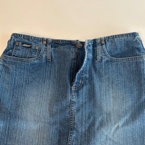 Y2K-era Squeeze denim pencil skirt in a classic blue wash. Features a straight pencil silhouette, five-pocket styling, and a front slit for easy movement. Early-2000s vibe that pairs perfectly with baby tees, tanks, or fitted knits.