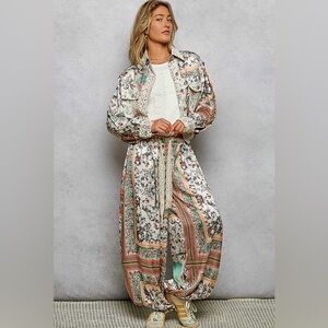 teal/jade cream peach red brown Lots of great colors. This is one of the prettiest POL jogger sets I’ve ever seen. Feminine. This lightweight fabric is perfect for spring summer and early fall! 97% Polyester 3% spandex. Brand new. Never been worn. Only removed from package to inspect. Size Medium. Roomy. Fits medium or large comfortably. Elastic waist & drawstring pants. I also have this same size and set available in blue paisley. See other listing. Also brand new never worn. NWOT smoke free pet free home.