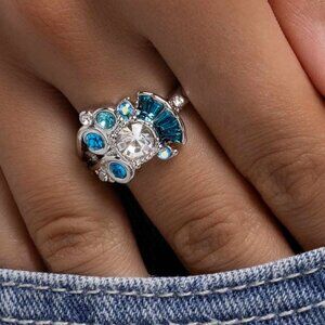 Exploding along the front of a dainty white rhinestone-encrusted silver band, a collection of white rhinestones and blue multicolored gems and rhinestones in varying cuts are pressed into various silver fittings for an elegantly eclectic centerpiece. Features a dainty stretchy band for a flexible fit. Due to its prismatic palette, color may vary.