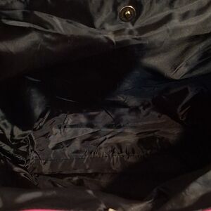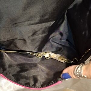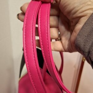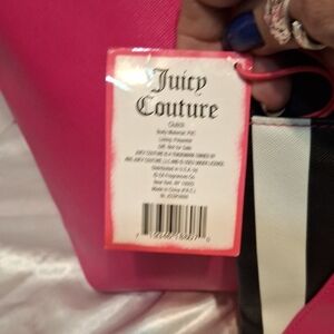 Bold pink tote with striking black and white striped sides. Elegant and practical for daily use. Juicy Couture branding adds a touch of luxury.