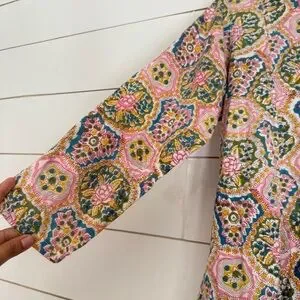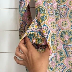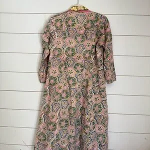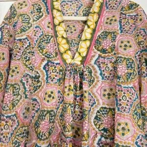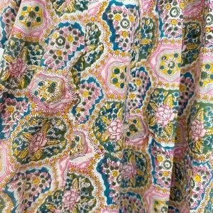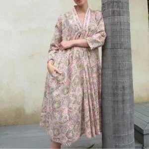 The fabric is 100% Indian cotton, featuring hand block printed designs with natural plant-based dyes and inks. They are not only eco-friendly but also soften beautifully over time. Each limited-edition dress is made with love and care by our talented sewing team in Los Angeles, to live in now and love forever.