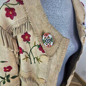 Native art beaded pins at lapels