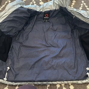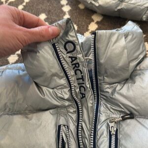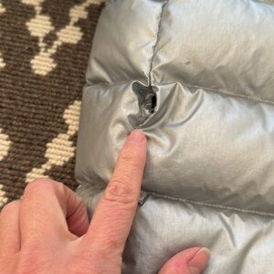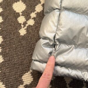Super warm coat!! Silver size M. Detachable hood. 2 small holes at seam in back, quick fix. Price reflects need to repair