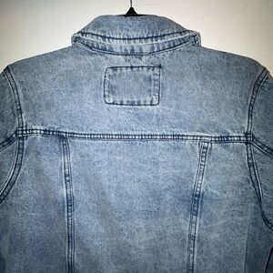 This Chic denim jacket features a playful double ruffle design at the base of the jacket. It is a very cute and trendy jacket from ‘Ashley Vintage Charm’ that is a size large. It has pockets on the front chest and a two layered ruffle at the hem of the jacket. The layered bottom of the jacket is 5.5 inches wide with the top ruffle being 3 inches wide. Though preowned this jacket is in perfect condition and shows no signs of wear. It measures 19 inches from pit to pit, 25.5 inch long sleeves, and is 17 inches across at the waist. This jacket is so cute and would make a perfect addition to your Wardrobe.