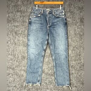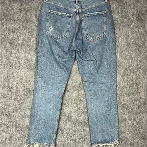 Stylish light blue jeans. Straight fit. Frayed hem for a modern look.