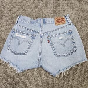 Trendy Levi's shorts. Light blue denim. Distressed style. Frayed hem.