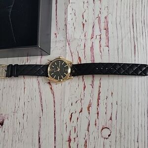 Elegant Citizen Women's Eco-Drive watch with a gold case and black quilted leather strap. Features a black dial with gold accents. Calendar date.