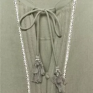 Cotton blouse with a round drawstring collar. V-neck and long sleeves. Features contrasting embroidered details, pintucks and front ladder stitch trim. Front button closure.