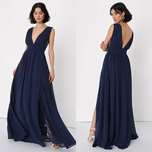 Lulus Exclusive! You'll be goddess-like for the entire evening in the Lulus Heavenly Hues Navy Blue Maxi Dress! Airy woven chiffon drapes alongside a V-neck and back, and lays across a banded waist. Full maxi skirt has a sexy side slit. Hidden back zipper with clasp.