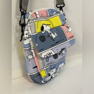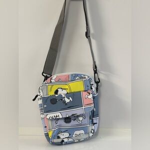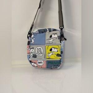 Fun crossbody bag featuring Snoopy in a comic strip design, comes with adjustable straps. Includes a mix of colors for a playful look.