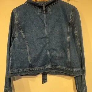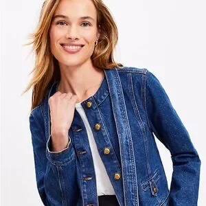 Elevate your denim game with this chic and feminine LOFT denim jacket. This isn't your average trucker—it features a stunning tie-neck collar that can be styled in a bow or left loose, giving it a polished, "lady jacket" vibe.