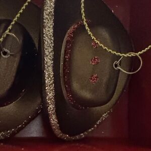 Set of western-themed Christmas ornaments featuring cowboy boots and horse heads. Perfect for adding a rustic touch to your holiday decor.