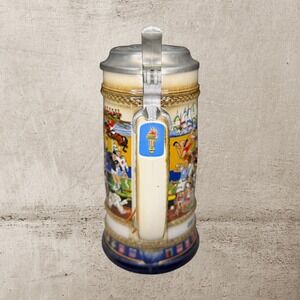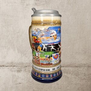 Keywords: Olympic Games, Seoul 1988, commemorative stein, collectible souvenir, pewter lid, sports memorabilia, German pottery, Anheuser Busch, Olympic torch, vintage collectible, beer stein, athletic events