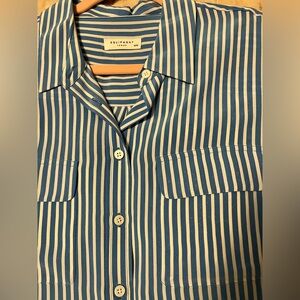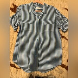 Gorgeous classic sky blue and white striped button up short sleeve shirt with placket cuff sleeves. Silk. Size medium