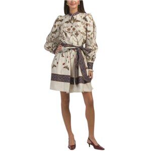 printed, tie belt, faux pearl accents, 2 side pockets, yoke detail, piped accent