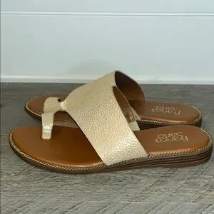 The Franco Sarto Gem Slide Sandal is a leather upper slide sandal with a simple, chic silhouette designed for everyday wear. The style includes a wide top strap and a delicate toe loop for a classic slide look. It’s typically a slip-on sandal with an easy, comfortable fit