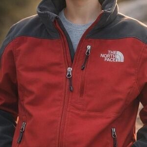 The North Face, TNF, Apex jacket, Apex softshell, boys jacket, youth jacket, kids jacket, boys medium, youth medium, size M, red jacket, gray jacket, fleece lined jacket, softshell jacket, wind resistant jacket, windproof coat, lightweight jacket, fall jacket, winter jacket, outdoor jacket, hiking jacket, school jacket, everyday wear