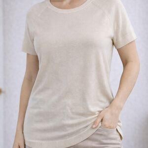 100% cotton, providing a soft, breathable feel. Features a classic round, ribbed neckline and a straight-cut hem. The textured knit gives it a slightly more elevated look than a standard jersey tee.