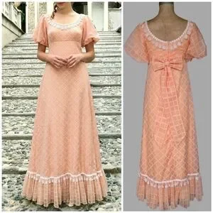 Vintage Bridgerton Puff Sleeve Orange Cream Bow Back Crochet Fringe Dress, XS/S