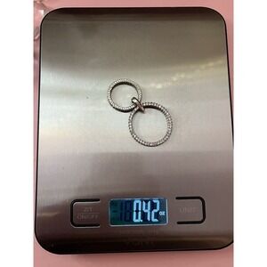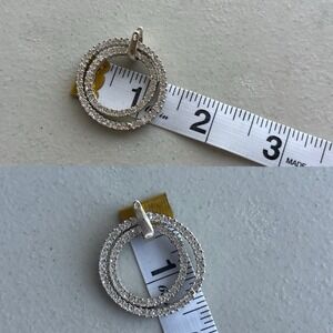 Silver tone double circle pendant featuring rows of clear rhinestones for a bright, sparkly look. The open circle design gives it a modern minimalist style that pairs easily with a variety of chains.
