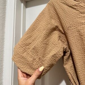 Made of textural seersucker, this button-back mini dress has