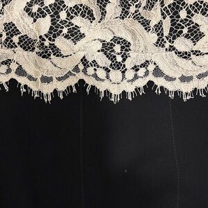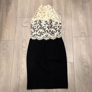 Elegant lace halter dress with a fitted silhouette. Features a classic black and cream design. Ideal for formal events.