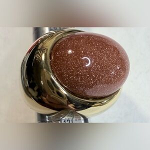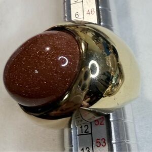 The ring is stamped inside TK316 indicating stainless steel. It is gold toned and done shaped with a cinnamon red goldstone.