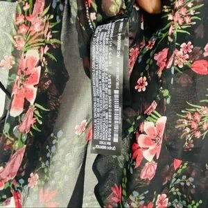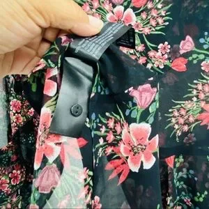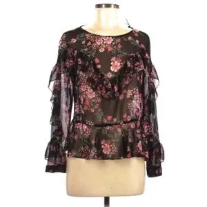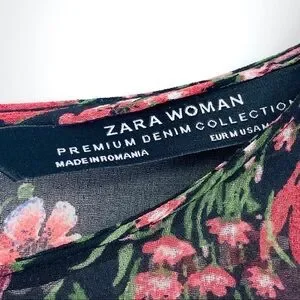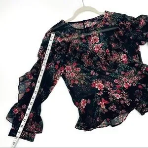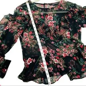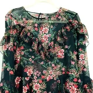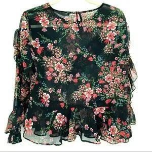 Zara Women Sheer black and Pink Floral Western Ruffle Blouse with flowy ruffle detail along front round collar and on sleeves. Bell sleeves and very feminine light breezy style. Perfect for spring.