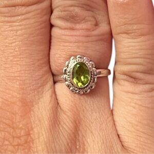 This artisan ring features a stunning peridot set in a beautifully crafted sterling silver band. Perfect for adding a touch of sophistication to any outfit.