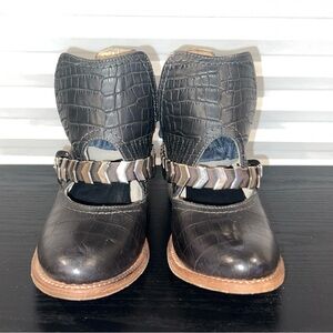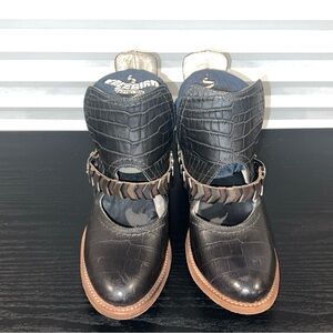 Pre loved with box. Excellent condition black croc print blade bootie. Buckle ankle detail. Short stacked wood heel. Slip on style.
