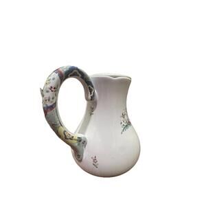 Authentic Atelier de Ségriès teapot from Moustiers-Sainte-Marie, France, hand-painted in classic Provençal faïence style. Features floral sprays on a white glazed body, with an ornate multicolor handle and spout over a turquoise dotted ground. Signed underside: “Atelier de Ségriès, Moustiers France.”
