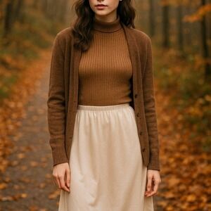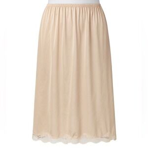 Soft and elegant vintage Vanity Fair half slip in a timeless neutral cream tone — the perfect layering piece for fall fashion. Features a delicate scalloped lace hem and smooth silky nylon fabric with gentle sheen. Elastic waistband for comfortable stretch and flattering fit. Knee-length design makes it versatile under dresses or skirts, or worn peeking out for a romantic vintage aesthetic.