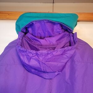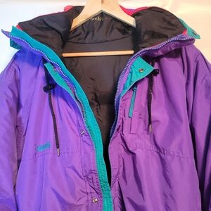 Stylish purple red and teal double ski / snow jacket. Features a cozy design and vibrant colors. Inner red puffer jacket can be entirely removed, held in place as a double layer jacket via zippers and a couple of sleeve cuff poppers. Excellent design and such a cool throwback retro style. Packable collar hood. Lots of pockets. EUC
