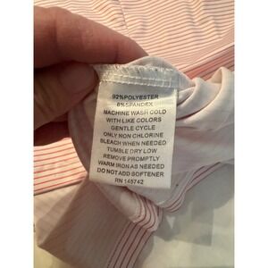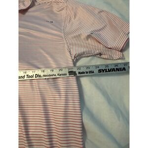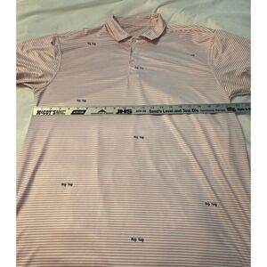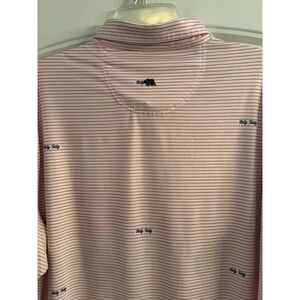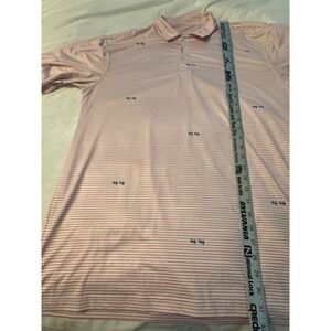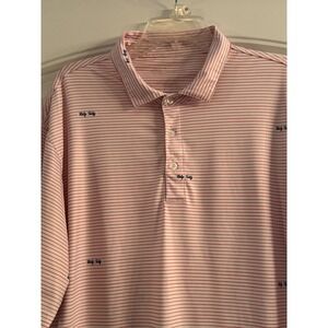 A men's performance golf polo shirt by Onward Reserve in a classic pink and white stripe pattern. This breathable short-sleeve polo features subtle Onward Reserve branding embroidered throughout the garment, including a small bear logo on the back yoke. A comfortable and stylish choice for the golf course or casual wear.