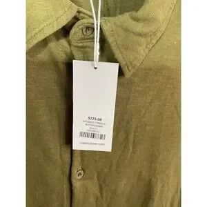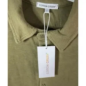 This Cotton Citizen Men's Presley Slub Knit Shirt in olive green features a solid design with a collared neckline and long sleeves. It has a button-up closure and is made of cotton fabric. The size is Large and it is machine washable for easy care. The shirt has a hipster, designer, bohemian, college, classic, hip hop, and preppy theme, with button accents.