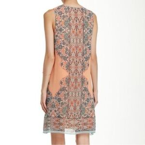 Effortlessly chic with a breezy, artful feel ✨ This Max Studio sleeveless shift dress features an intricate scarf-inspired floral and geometric print in warm peach, orange, and lush green tones.