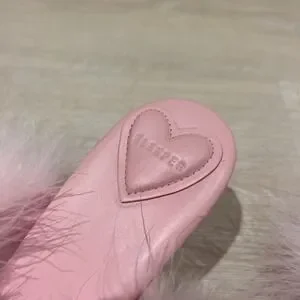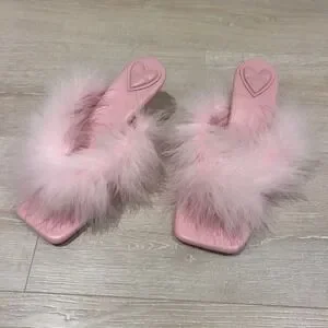 Sleeper Manon pink leather mules with ostrich feather trim and a square toe silhouette. These elegant slip-on sandals feature a cushioned heart-shaped heel pad for comfort and a minimalist leather sole. The voluminous feather straps add a playful, glamorous touch to the classic mule design, making them perfect for bridal events, parties, or elevated loungewear. Includes original Sleeper dust bag. Runs slightly small.