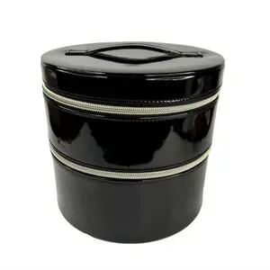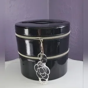 Stylish round cosmetics/jewelry box in black with a vibrant pink interior. Features a convenient zipper closure and 1 built-in mirror on top compartment, as shown.