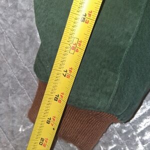 Features a classic Western-inspired colorblock design with a tan/brown suede body and dark green suede sleeves.