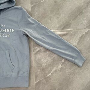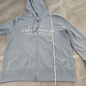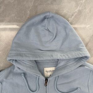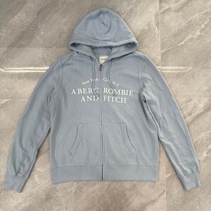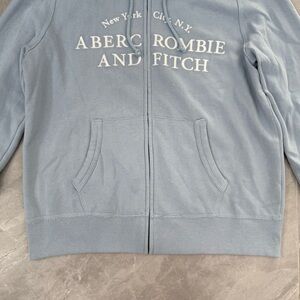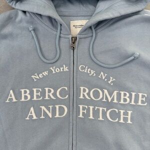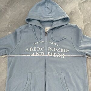 Good condition - Women’s Abercrombie & Fitch Y2K Soft Collection New York City Full Zip Hoodie. Has two front pockets, full zip closure, and drawstring in the hood. Colors: blue and white. Size: M.