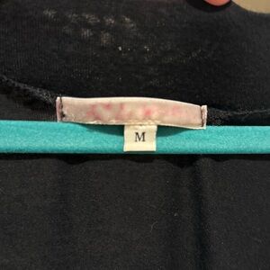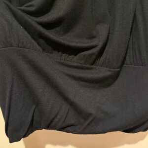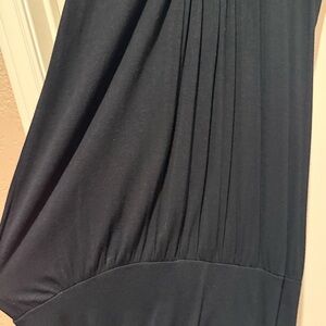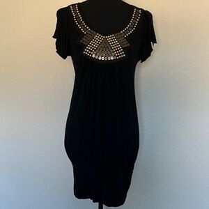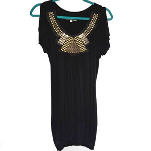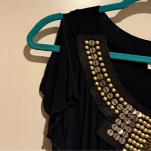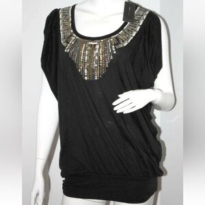 Super fun vintage Y2K solid black dress/mini dress or tunic top with little split style short flutter sleeves, banded bottom hem and lovely felted neckline bib detail with heavy gold tone bead and sequin embellishments! I think the brand was Julie’s Closet or something — it is faded as shown. (boutique brand) It looks a lot like a BCBG one I had around the same time too! (See photos) This can be worn pulled down further or with the band up higher. (I remember pairing with a cool black blazer, tights and knee high boots, etc.)