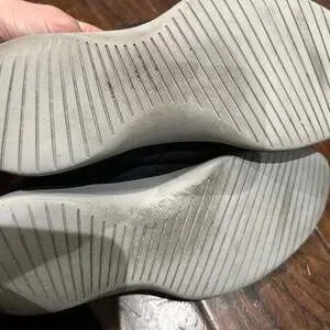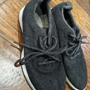 Allbirds Men's Wool Runners in a versatile charcoal gray, size US Men's 9. These sneakers are known for their comfortable and breathable merino wool upper, making them ideal for everyday wear and light activities. The shoes feature a minimalist design, dark gray laces, and white soles. They are in used condition with signs of wear consistent with normal use, including some discoloration and minor scuffs on the soles as shown in the images. Despite the wear, they offer plenty of life left and retain their signature comfort.