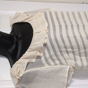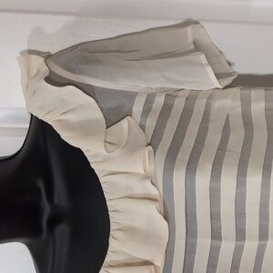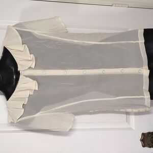 Very good gently used condition. Button up the back (spare button still attached to tag). Ruffle around collar. 100% silk. Size med. Please see photos for measurements to determine fit.