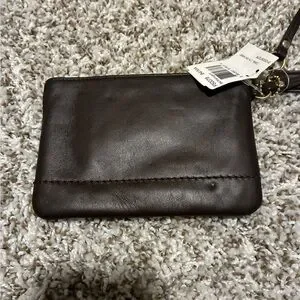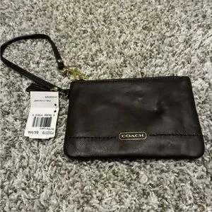 Chic dark brown leather wristlet by Coach. Compact design with a convenient wrist strap.