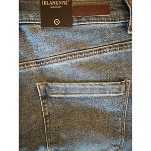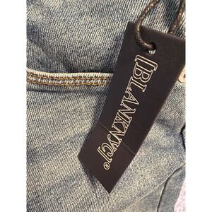 BlankNYC denim shorts in a classic blue wash offer a timeless look with a modern high-rise fit. These cuffed shorts feature a five-pocket design, tonal stitching, and the brand's signature hardware. The stretch denim blend ensures a comfortable, flattering fit for all-day wear, while the rolled hems add a casual, laid-back vibe. This item is in new condition with tags attached.