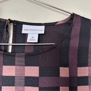 This women's long-sleeve blouse from Liz Claiborne is a sleek polished top that will elevate your looks for the holidays, work, or other gatherings. Made from soft satin with a plaid print, this blouse has a round neckline, long sleeves, and a back button-loop closure. Team it with tailored pants or jeans.