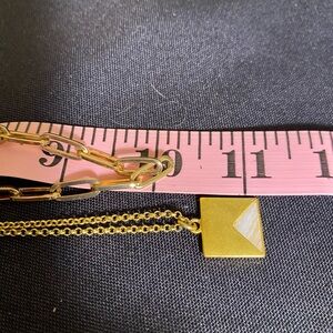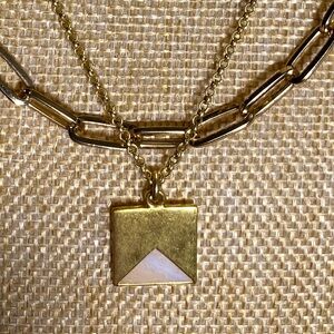 Madewell Palisade Gold Plated Brass Necklace Set from Nordstrom. Longest Features Inlaid Semi-Precious Stone Pendant. The Paperclip Chain is 10”, The Pendant Necklace is 11” each with 3” extensions extended. Lobster Clasps. Nickel Safe.