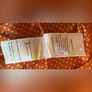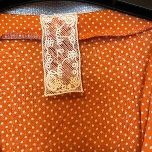 Muted orange color with white polka dots. Button down front. Flutter sleeve. High/low hem. Super cute for summer with a pair of white shorts!