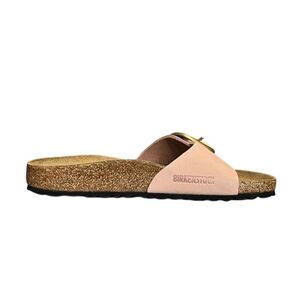 Discover the perfect blend of style and comfort with the Birkenstock Madrid Big Buckle Sandal in a delightful pink hue. Crafted from soft nubuck leather, this women's slide features a contoured cork footbed that molds to your foot for unparalleled support. The suede lining and EVA sole ensure a cushioned step, making it ideal for casual summer outings or leisurely strolls. With its chic buckle closure and flat heel, this sandal is a versatile addition to any wardrobe. New with tags.