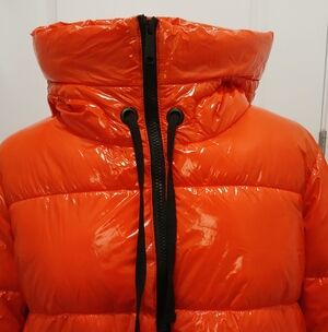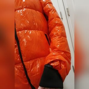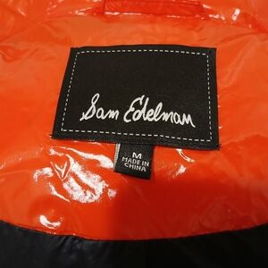 Worn once so basically new, Sam Edelman, size medium, shiny puffer coat. The inside cuff of the sleeves are stretchy and there is an option to cinch on the bottom for a closer fit. Has a hood with drawstrings and a high collar. The color is a red-orange. See pic for a dark red comparison.